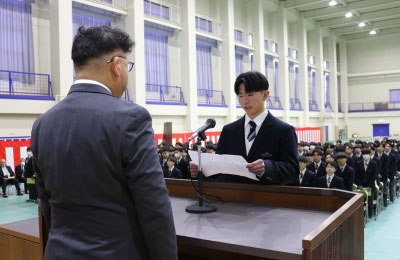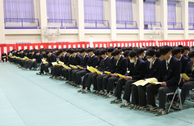 卒業証書授与式の予行演習後、本校同窓会役員の皆様をお迎えし、「令和七年度同窓会入会式」を行いました。